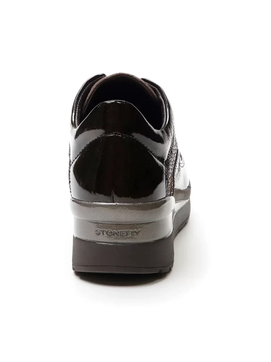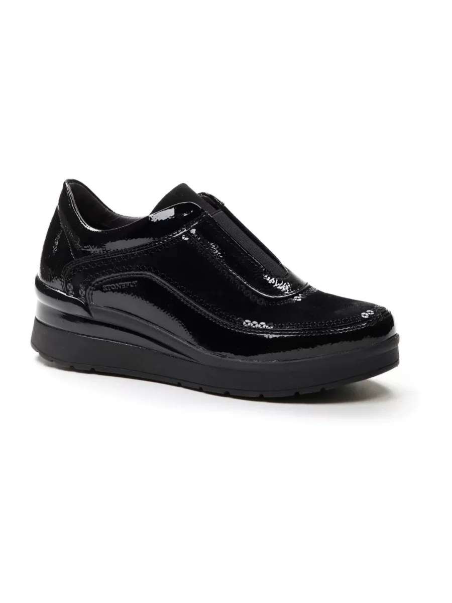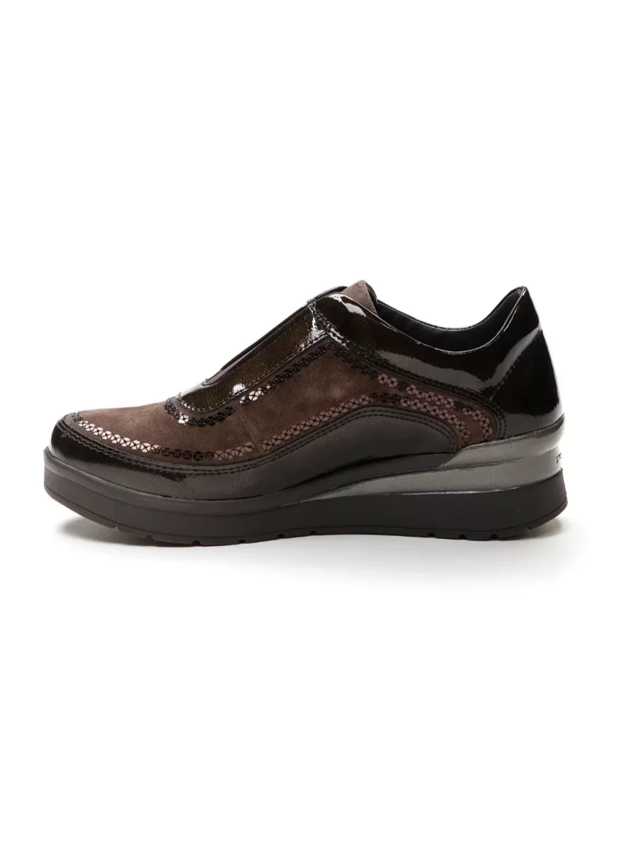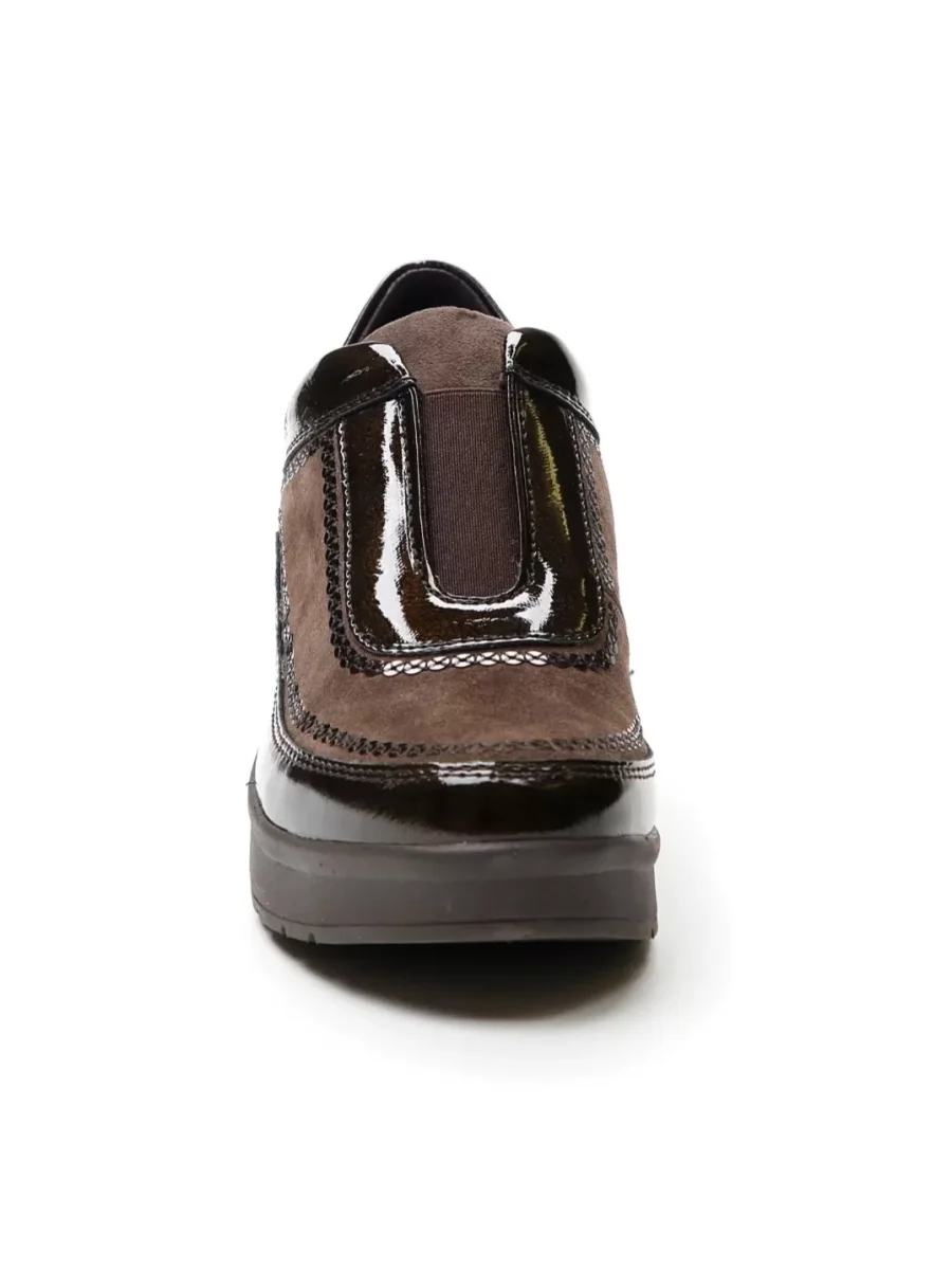 TOMAIA IN PELLE VERNICIATA CON INSERTI IN CAMOSCIO E CORNICE DI PAILLETTES