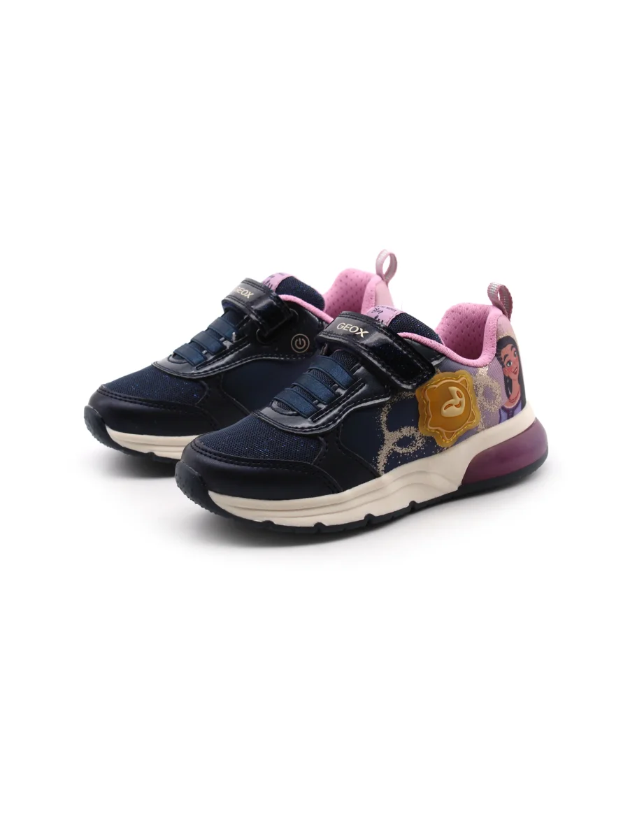 Sneaker con luci da bimba Geox Disney Spaceclub in tessuto con stampe e materiale sintetico con luce laterale, soffice plantare traspirante in tessuto e suola traspirante in gomma con luci. Comoda da indossare grazie alla chiusura con lacci elastici e velcro.