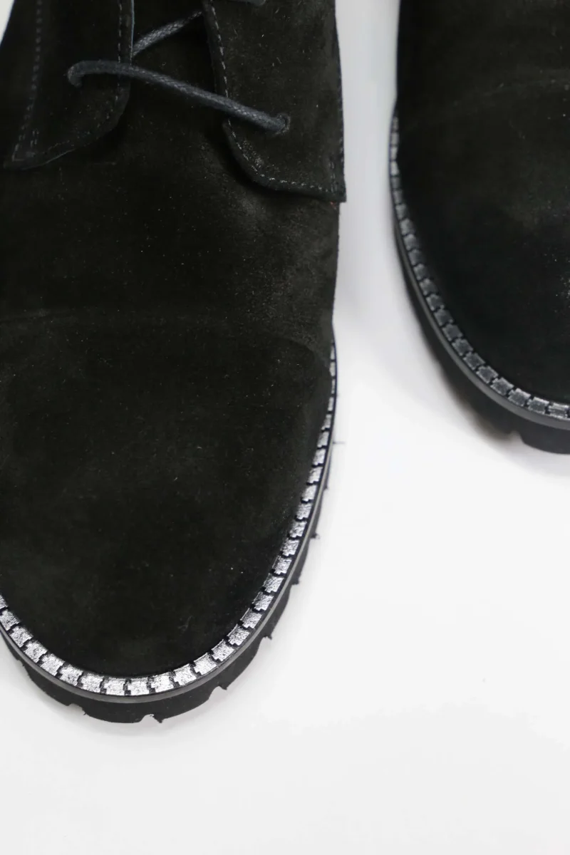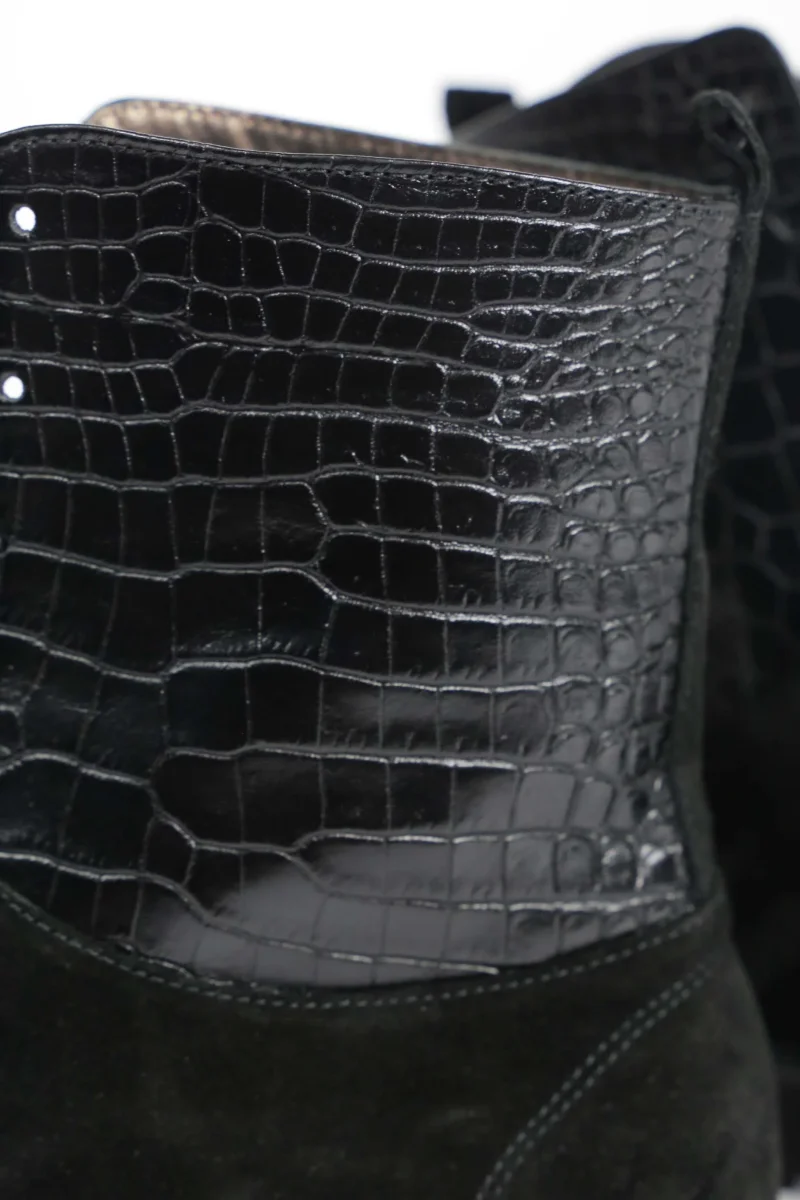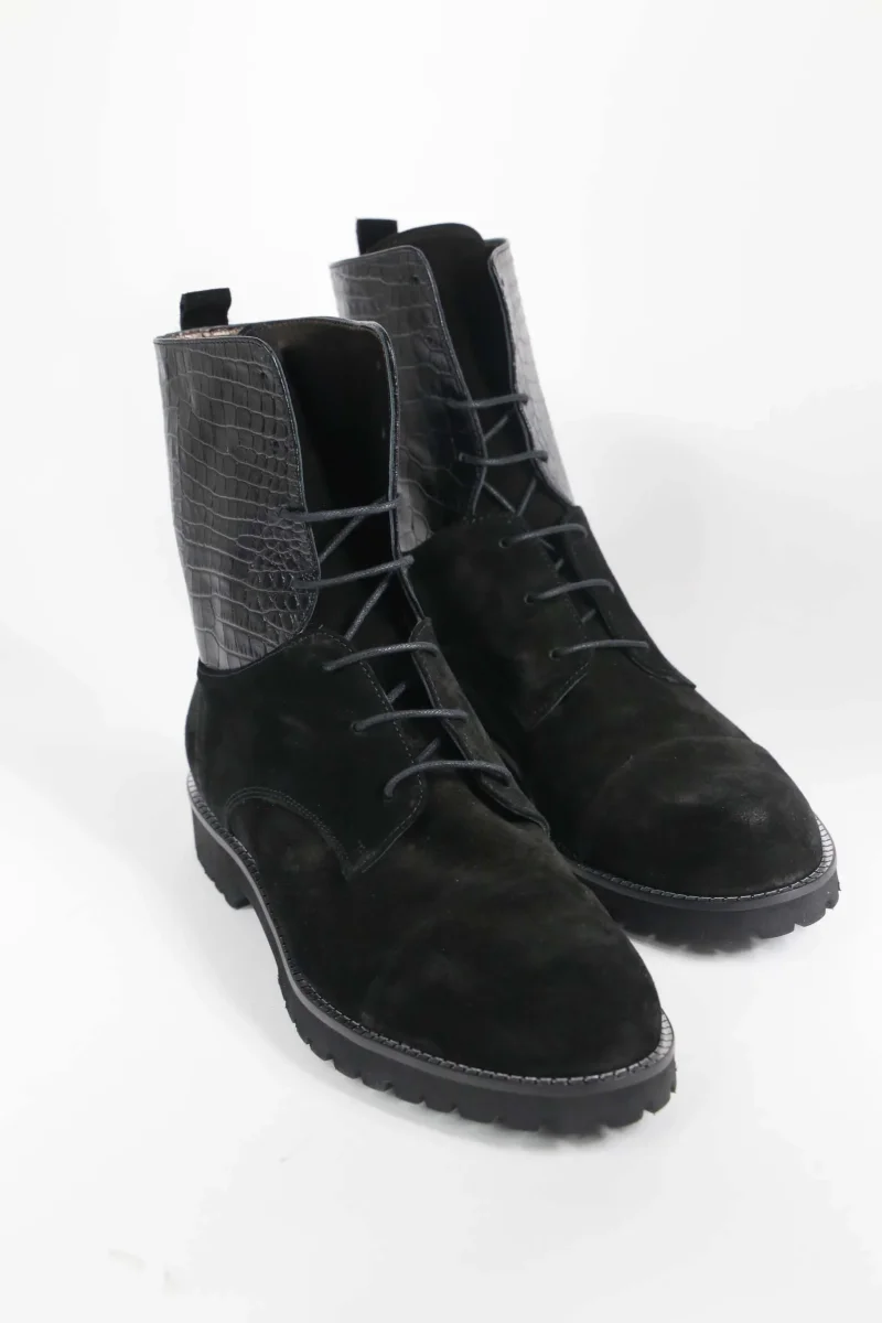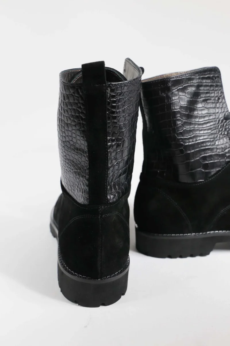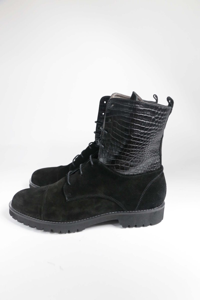 Stivale Adele è basso e stringato, in vera pelle in camoscio ed effetto coccodrillo dona carattere e luce al tuo look, la suola è in gomma e la punta è arrotondata, manifattura artigianale e made in Italy, disponibile nei numeri grandi donna dal 42 al 45