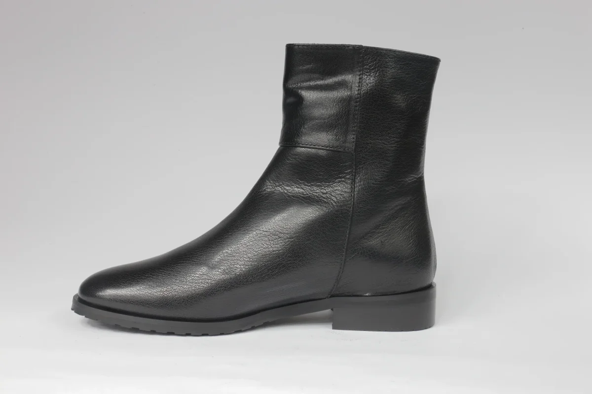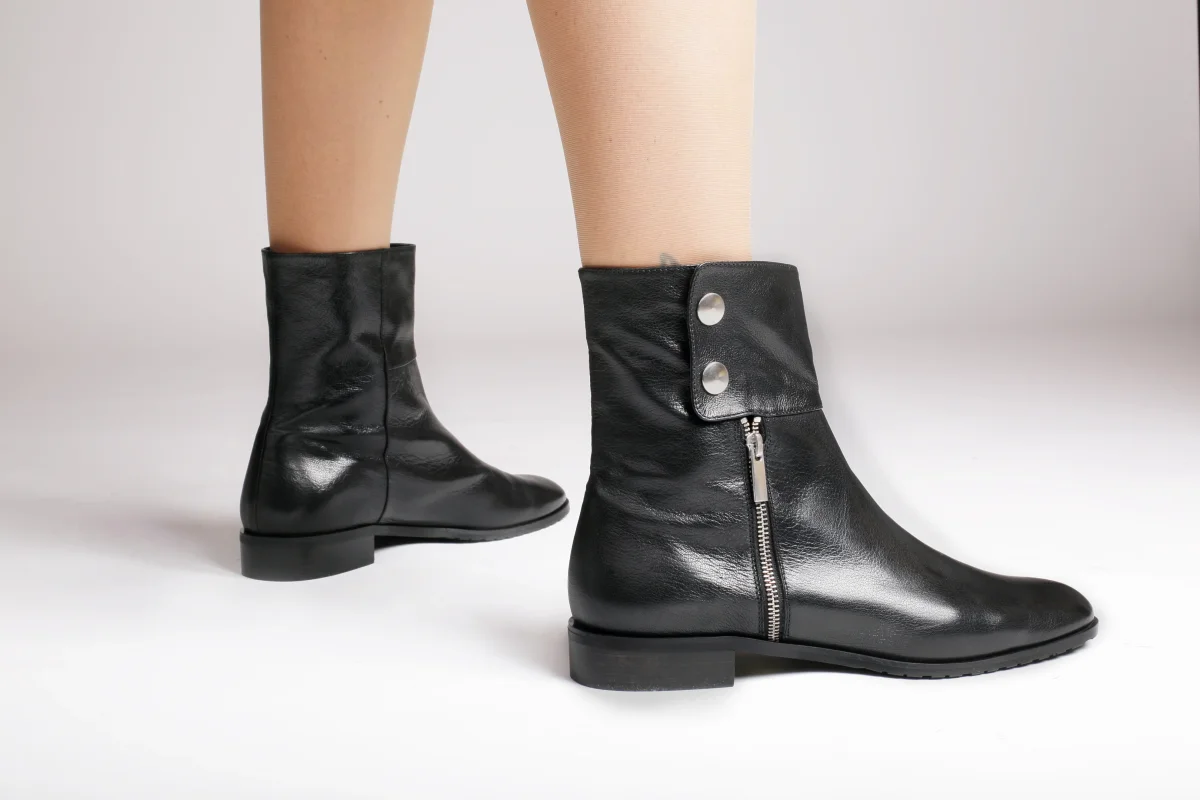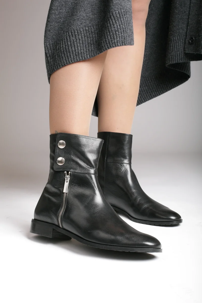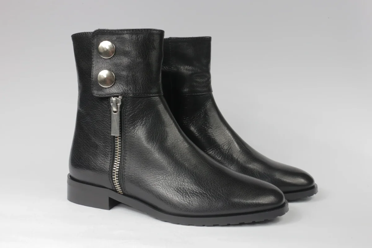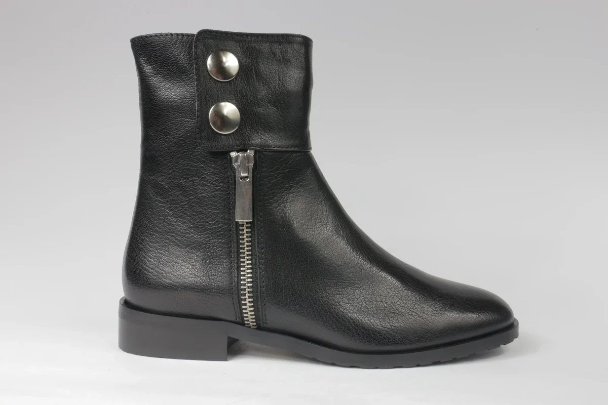 Stivaletto da donna in pelle nera, cerniera e bottoni color argento, punta tonda interno in pelle. Artigianalità italiana, disponibile in numeri piccoli e grandi.